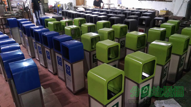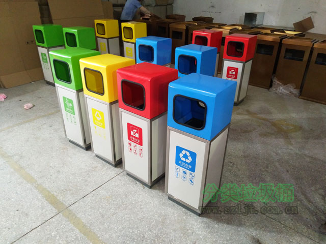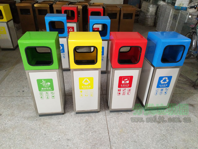 這批垃圾桶是供商場及其附近的商業街適用,適用鋼板材料,外表烤漆成綠黃紅藍四色,分別代表廚余垃圾,其他垃圾,有害垃圾,可回收垃圾,分類明確詳細,有利于人們垃圾分類減量。由于采用鋼板烤漆材料,所以垃圾桶防水防曬防腐蝕,再加上其本身的外觀設計大方典雅,所以室內戶外都能夠適用。