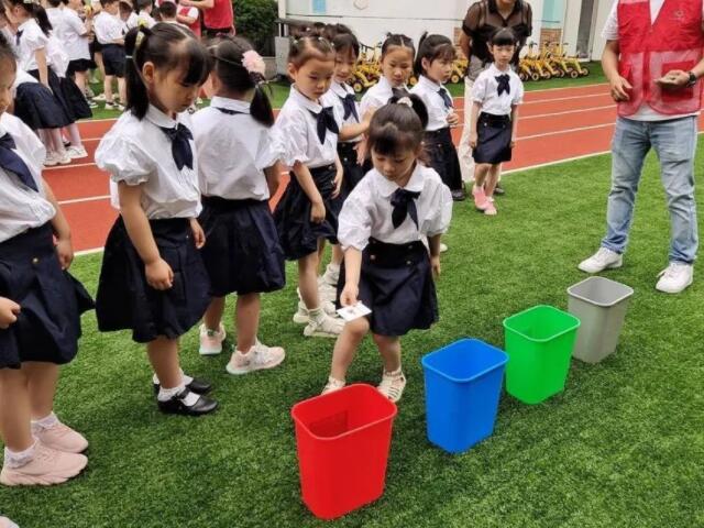 “可回收物放藍色、有害垃圾放紅色、廚余垃圾放綠色、其他垃圾放黑色”。垃圾分類宣傳員拿著四色垃圾桶,教小朋友們生活中常見的垃圾該如何分類。河湖長制專班工作人員科普了水生態保護知識,鼓勵大家從小事做起,增強節水意識。
