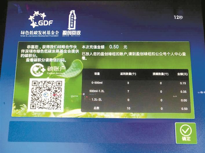 這臺機器專門回收塑料瓶,2L以下的都能投放。第一次,韓女士帶了3個塑料瓶去投放,按照操作提示關(guān)注了該公司的公眾號后用手機號碼注冊了賬號。然后依次投入了3個飲料瓶,屏幕顯示選擇“捐贈”或“返利”。韓女士選擇“返利”后就在微信上收到了返利成功提醒,共0.15元。她最后選擇了提現(xiàn),一分鐘后,錢款自動到賬微信零錢包。