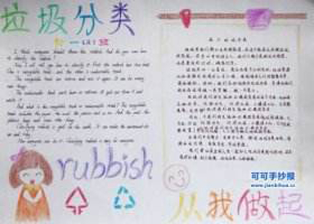 我們每個(gè)人一天雖只制造出一公斤左右的量,但是整個(gè)地區(qū)加起來,所產(chǎn)生的垃圾量的總和就相當(dāng)大。因此,解決垃圾問題,首先就是以垃圾減量開始,然后做到分類回收,最后才是處理。我們平時(shí)所說的“垃圾減量”,實(shí)際上有兩層含義:1.減少個(gè)人垃圾的生產(chǎn)量:2.拓展垃圾用途,廢物利用,使垃圾不成為垃圾;垃圾分類精美手抄報(bào)有分類垃圾桶網(wǎng)收集整理。