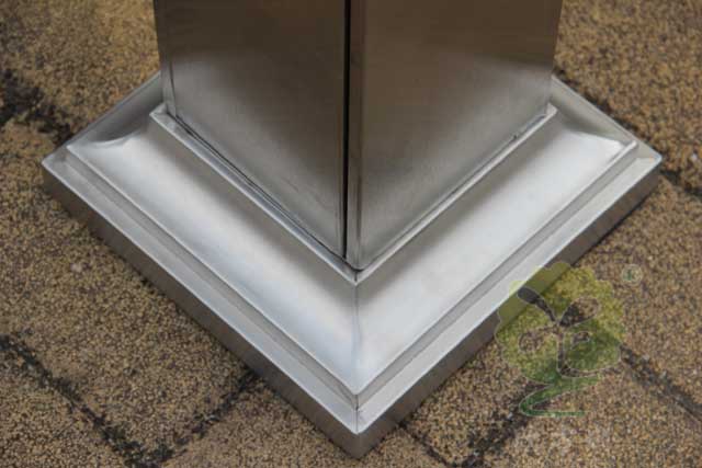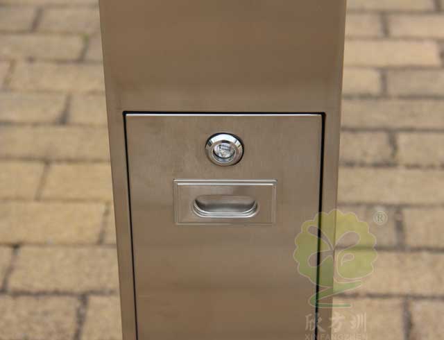 C-279C金屬煙灰柱規格250*250*1185mm,呈長條傳,側面有三角鑰匙,可以打開側門,方便清理位于內套管的煙蒂煙灰,底座分兩種,一種是室內采用的,在底部裝有防滑墊,一種是戶外采用的,底部使用膨脹螺絲固定。