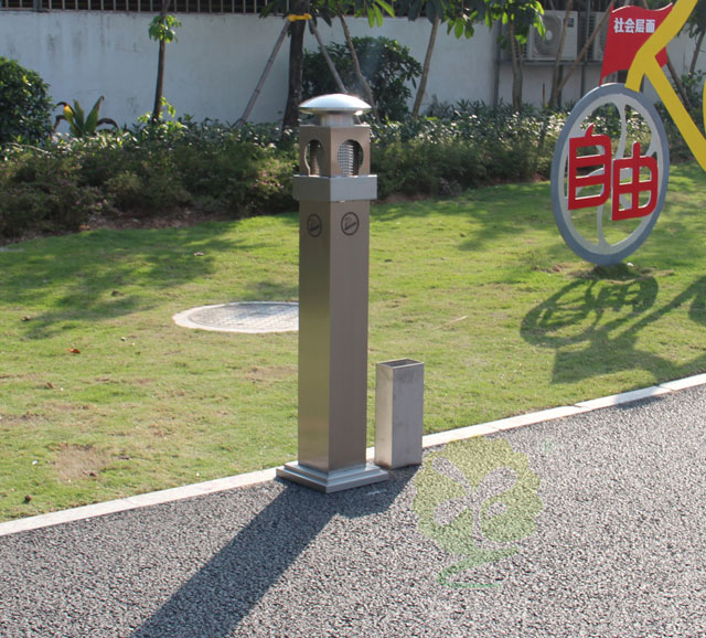 C618室外街道滅煙柱采用優質不銹鋼剪切、組裝、焊接、絲印而成,它包括外套管、支座、內套管、煙灰盒、底座。外套管的底端固定連接在支座上,外套管的側壁上設有煙蒂置入口,內套管用于集中收納從外套管的煙蒂置入口投入的煙蒂,內套管設在外套管的內管腔中,內內套管的開口端朝上,煙蒂置入口與內套管的開口相連通,以使得從煙蒂置入口投入的煙蒂可從內套管的開口端落入到內套管的內管腔中;