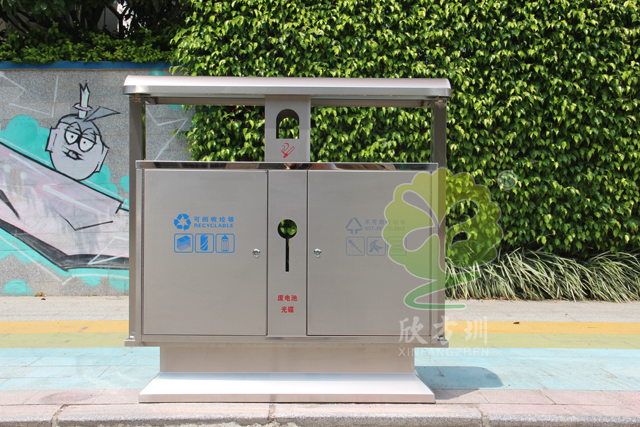 不銹鋼戶外街道分類垃圾桶型號(hào)XFZ-C188,規(guī)格1000*360*1000,工廠專業(yè)工人經(jīng)過(guò)剪板、折彎、焊接、打磨、噴塑、組裝工序,使桶身光滑亮麗,堅(jiān)固耐用,防火防銹。