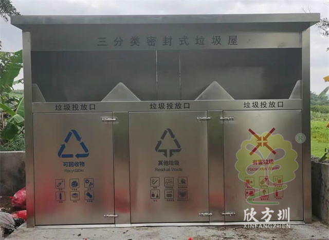 戶外城鎮密閉式三連體不銹鋼分類垃圾桶桶身采用優質 201#不銹鋼 1.0mm 厚度生產的,戶外連體三分類屋形設計,絲印單色的分類標識,可回收物藍色油墨,有害垃圾紅色油墨,其他垃圾黑色油墨,頂部和投口都采用了油墨絲印了黑色名稱標識,箱體不帶里面的塑料內筒,內筒是使用常規240L塑料垃圾桶。