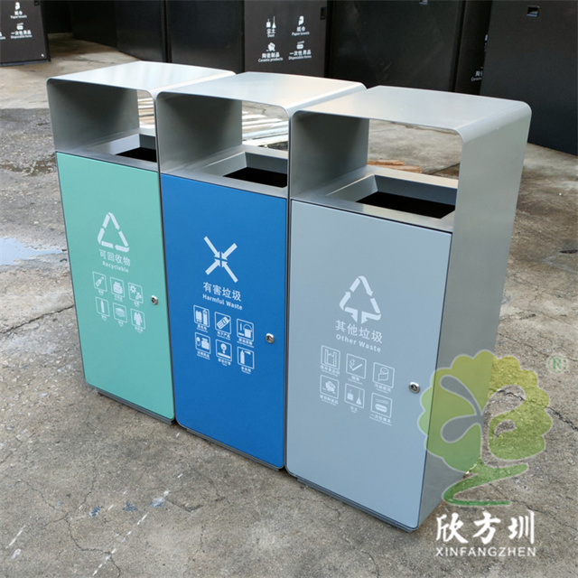 室外加厚組合三色不銹鋼分類果皮箱使用了201#不銹鋼板制作,外部框架采用了2.5mm厚,桶身采用了1.0mm厚的不銹鋼板裁剪折彎制造,單筒雙面側面投口方形設計,可以任意自由組合分類,外部框架噴塑灰色,門板正反面噴塑了不同的顏色,可回收物噴塑淡藍色、有害垃圾噴塑天藍色、其他垃圾噴塑了淡灰色,可以組合制作兩分類、四分類、五分類。