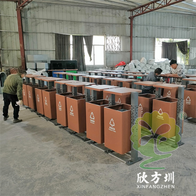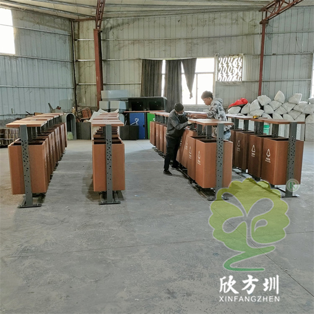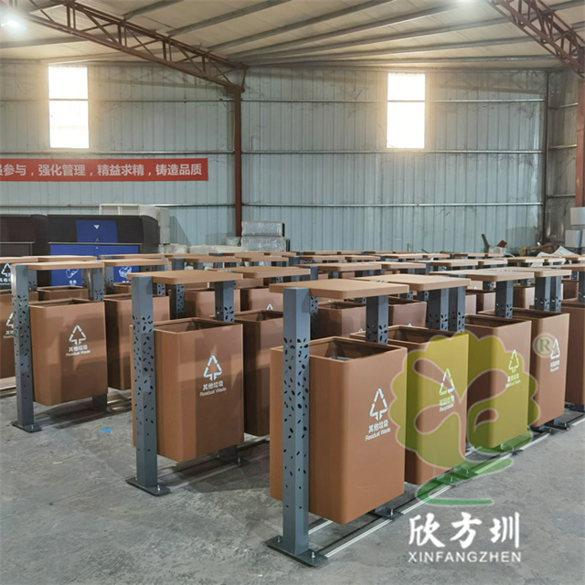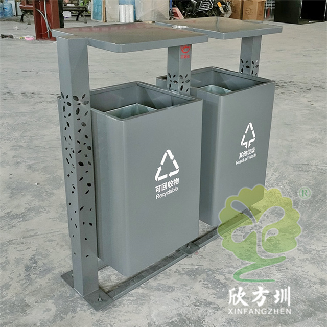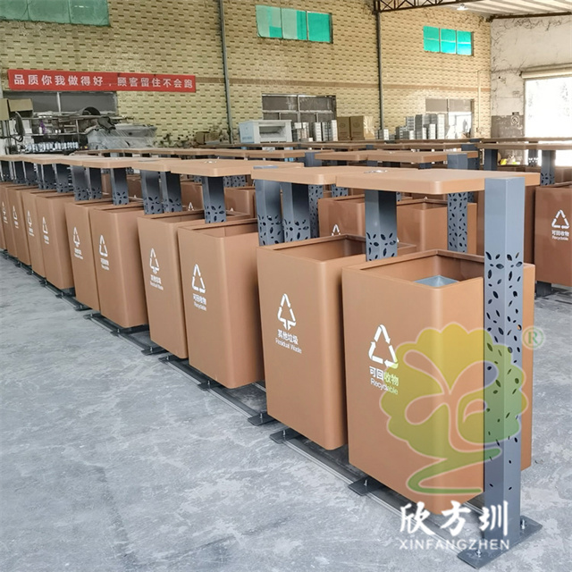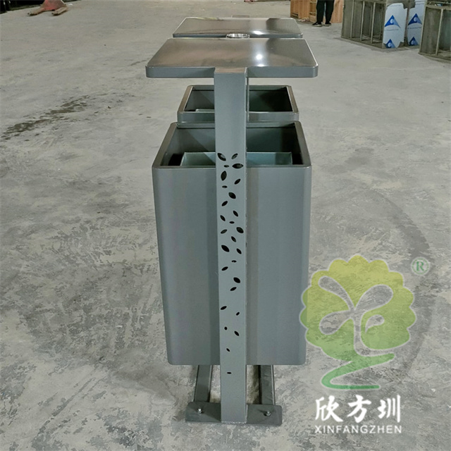 廣東惠州景區鏤空立柱不銹鋼分類垃圾桶整體1.0mm厚噴塑外筒,方形任意組合式多分類設計,可以選擇用不銹鋼板制作桶身,桶身表面噴涂噴塑了米白色,背后可使用三角鑰匙開始開門取出內筒,內筒鍍鋅板0.4mm厚,正面絲印了最新國標分類標識,有現成的網版可以免費絲印分類標識。