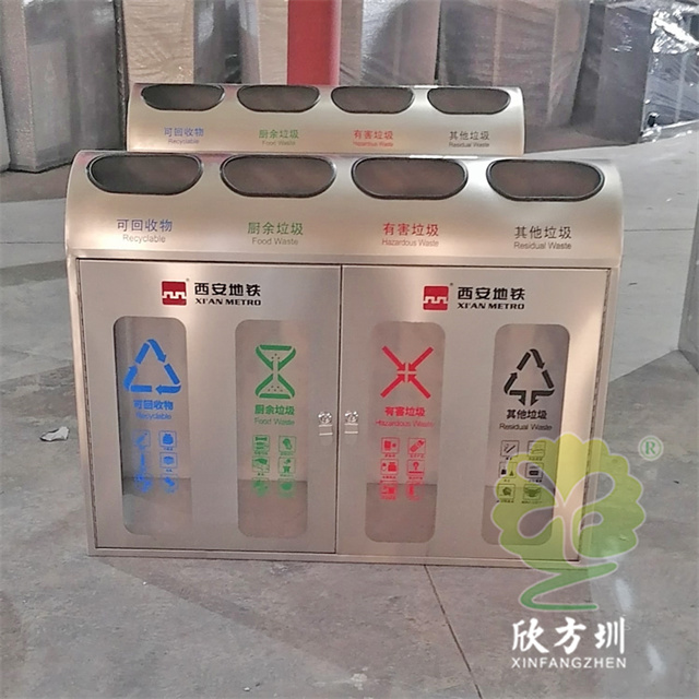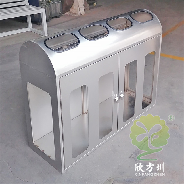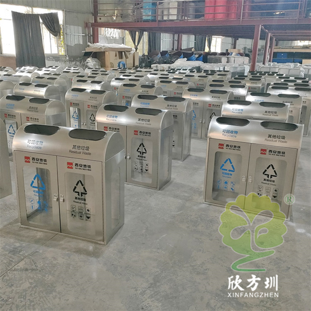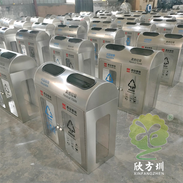 陜西透明防爆不銹鋼分類垃圾桶外筒201不銹鋼,1.2mm厚度(足1.12mm)用戶定制了兩種規格兩分類和四分類的,這款果皮箱不含內筒,桶身正面開門,正面和兩個側面有透明亞克力板4mm厚度(足3.75mm),桶身正面絲印分類標識和西安地鐵的LOGO,投口粘黑色膠條有效防止割到手,可以打木架或者紙箱包裝,帶導軌和彈簧。
