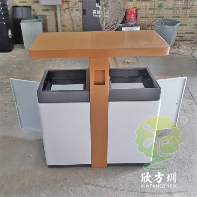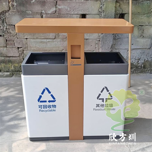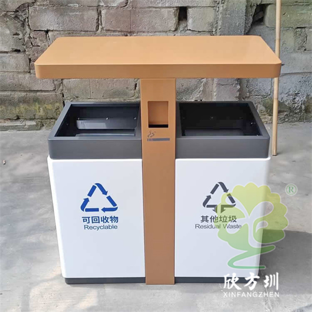 戶外噴塑雙開門不銹鋼分類垃圾桶外筒優質201不銹鋼1.0mm足0.92mm,采用了三色噴塑桶身白色、底部和投口灰色、立柱和擋雨棚黃色噴塑,側面三角鑰匙開門可以取出內筒,正面絲網印刷分類標識,頂部雙面煙灰盅投口。