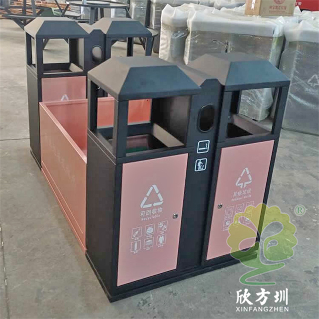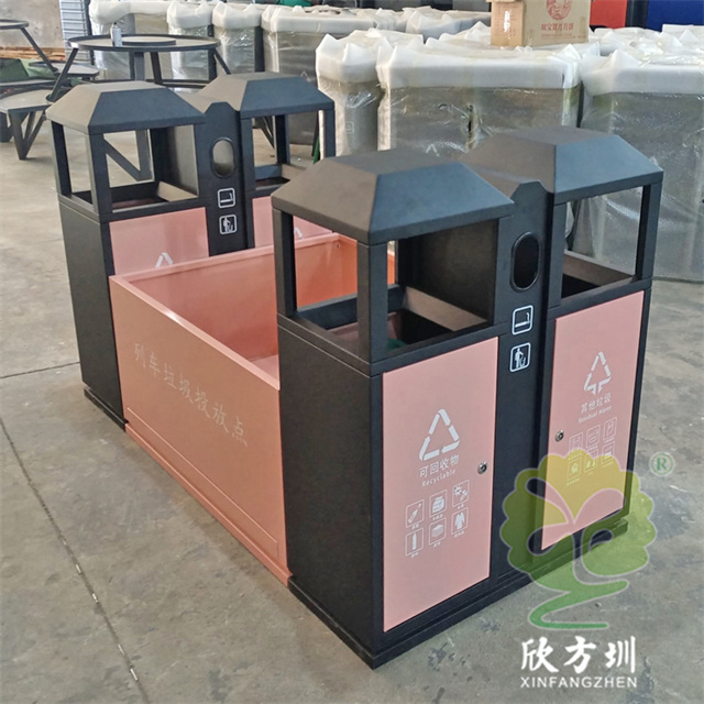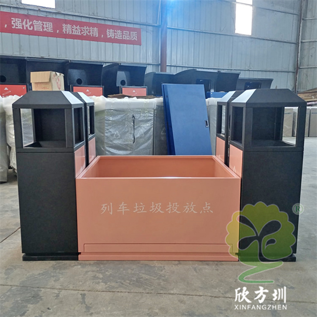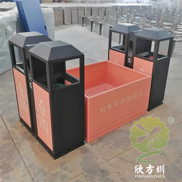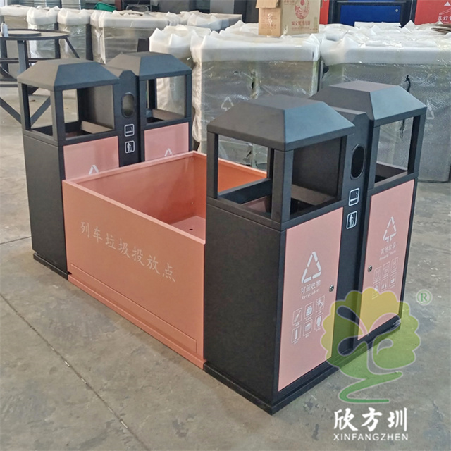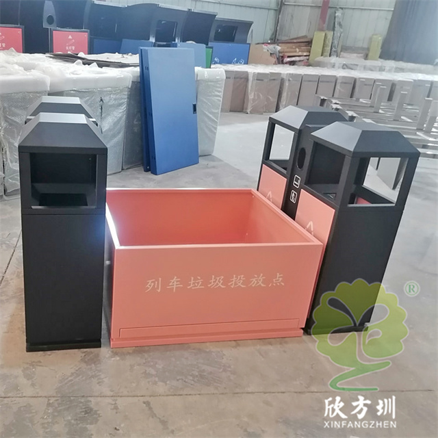 高鐵站火車站組合式不銹鋼分類垃圾桶材質(zhì)可以使用304不銹鋼板1.2mm厚制作,可以選擇鍍鋅板、201不銹鋼板定制,框架黑色噴粉烤漆,投放點和門板粉色噴塑,組合式兩個雙分類桶設(shè)計,絲網(wǎng)印刷最新國標(biāo)分類標(biāo)識和列車?yán)斗劈c,雙桶側(cè)面中上部分雙面帶煙灰盅,可以定制形狀尺寸和顏色。