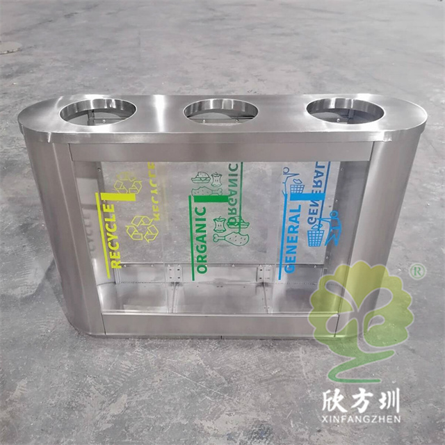 外貿室內環衛透明三分類不銹鋼垃圾桶可以采用201或者304不銹鋼板制作,橢圓形直投口三分類設計,透明部位可以采用亞克力板或者鋼化玻璃制作,投口帶不銹鋼鋼管壓垃圾袋,透明板可以絲網印刷中英文分類標識,支持定制兩分類四分類顏色尺寸或帶漏水槽,無內筒套透明塑料垃圾袋,便于環衛工人進行垃圾清倒,適合擺放場景:室內機場候機廳、高鐵站候車廳、購物商場、地鐵站等等。