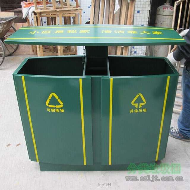小區(qū)物業(yè)戶外防銹鋼制分類垃圾桶規(guī)格:400*450*800mm采用優(yōu)質(zhì)冷軋鋼材料經(jīng)沖床沖孔、防銹、防腐處理后表面烤漆處理,耐火安全,抗高低溫,適合各種惡劣氣候條件,堅(jiān)固耐用,不易破損,具有款式多樣化,色澤多樣化,經(jīng)久耐用等優(yōu)點(diǎn)。垃圾桶底部射有螺栓孔,可將垃圾桶直接與地面固定,在一定程度上也可以防止被偷。本款垃圾桶包含一個(gè)0.5mm的鍍鋅內(nèi)膽,內(nèi)膽底部打了四個(gè)孔,方便雨天雨水滲漏,也能很方便的將垃圾從桶內(nèi)清理干凈。表面經(jīng)過(guò)除油、噴砂防銹處理后,再進(jìn)行酸洗磷化處理;表面清理干燥后整體進(jìn)行靜電噴涂或烤漆處理,靜電噴涂是經(jīng)過(guò)流水線高溫固化爐固化后再出爐冷卻,加工后的塑粉附著力強(qiáng),不易剝落,這樣戶外防銹效果才會(huì)好。該款垃圾桶樣式比較簡(jiǎn)單,是比較常見(jiàn)的一款戶外垃圾桶,在街道、小區(qū)、物業(yè)、廣場(chǎng)等等眾多的公共場(chǎng)合都在用此款垃圾桶。