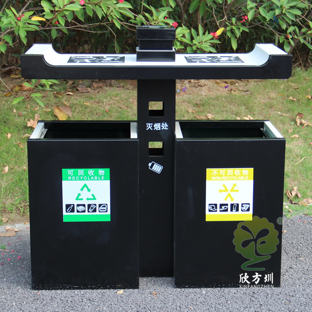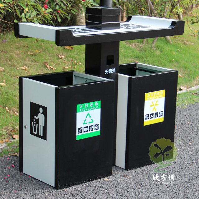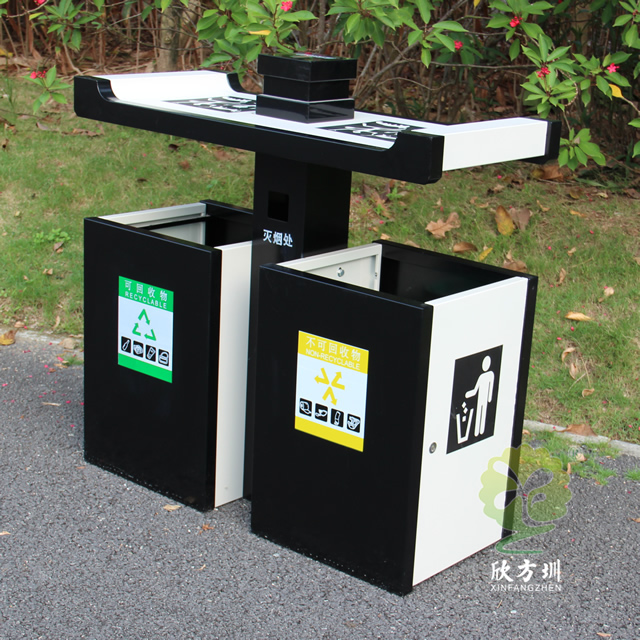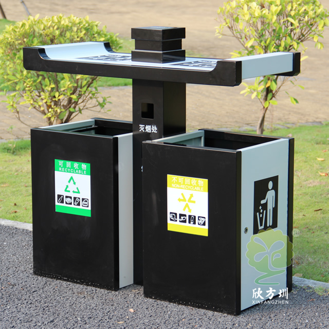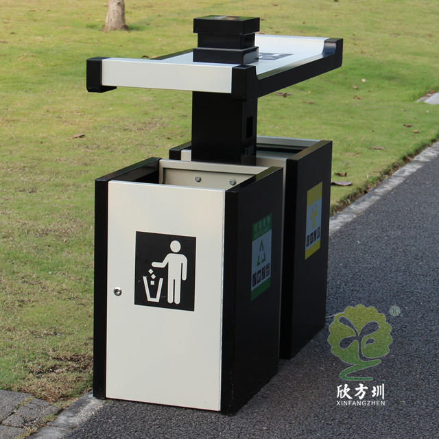 F348物業戶外鋼制噴塑分類垃圾箱,城市發展日新月異,人們對生活環境的衛生要求也越來越高,沒有人可以容忍自己家園周圍看上去臟、亂、差。整治臟、亂、差,建設衛生文明居住環境,是大部分城市的基本目標,居住環境的衛生整治離不開垃圾桶的幫助,甚至垃圾桶本身就能成為城市文明的一道亮麗風景線。沒有人愿意親近一個看上去布滿污漬,臟兮兮,充滿細菌的垃圾桶,而一個看上去干凈、衛生、美觀的垃圾桶,除了人們更愿意往里面投垃圾外,本身就能起到裝飾美化的作用。欣方圳設計生產的物業戶外鋼制噴塑分類垃圾箱就完全滿足這樣的作用。
