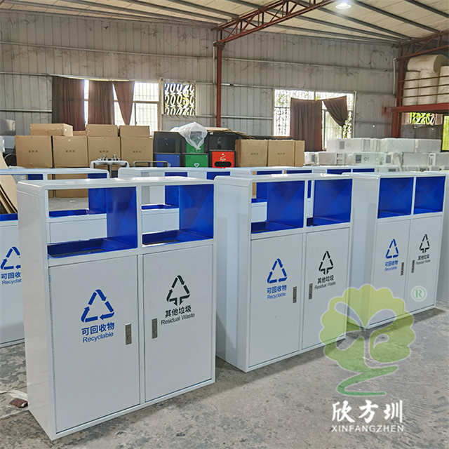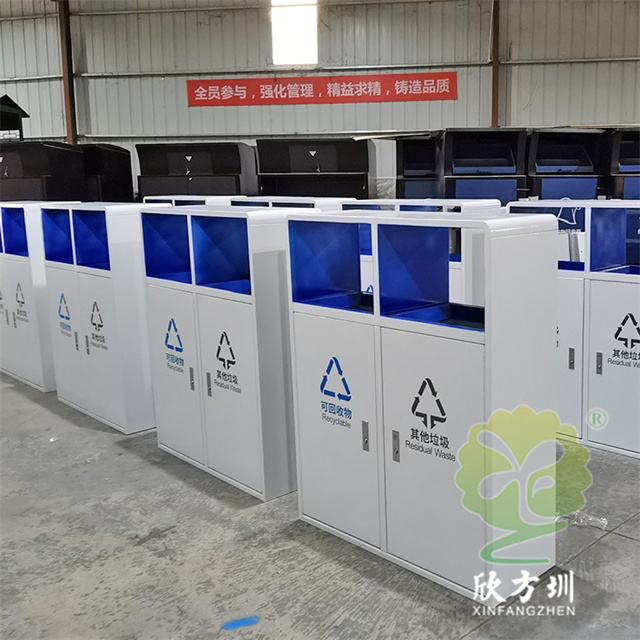 戶外方形烤漆白色鍍鋅板分類垃圾桶采用了1.00mm厚的鍍鋅板制作而成,雙面投口方形兩連體分類設(shè)計(jì)簡(jiǎn)潔大氣,兩面絲網(wǎng)印刷了其他垃圾和其他垃圾的最新國(guó)標(biāo)分類標(biāo)識(shí),開(kāi)門(mén)方式采用了磁吸方式推拉無(wú)需三角鑰匙, 我們廠家支持冷軋鋼板、不銹鋼、表面電鍍、烤漆、噴塑上色定制,每個(gè)城市都有每一個(gè)城市垃圾桶設(shè)計(jì)方案。