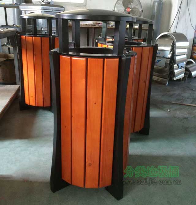 圓形單桶鋼木果皮箱桶身采用優質進口防腐木、進口山樟木或水曲柳制作,可抑制生物、微生物的寄生、繁殖與侵蝕,延長木材在戶外環境中的使用壽命。表面經過除蟲,防蟻,防腐,烘干等專業處理后加工成型,經久耐用,防腐美觀。桶蓋/內膽采用FRP玻璃鋼材料制造,具有防腐、防生銹、易清潔等特點。底座采用玻璃鋼纖維制作,從根本上解決了防腐、防盜、生銹的問題,產品在戶外的使用壽命大大增強。此款垃圾桶無論是從外觀,性能還是環保方面來講都十分優越,尤其適合擺放在花園,公園,小區,學校,街道,景區,游樂園等場所,備受客戶青睞。