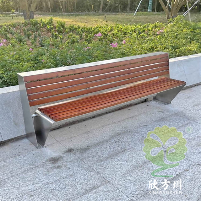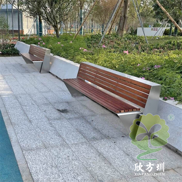 不銹鋼座椅公園椅:整體外觀和普通的公園椅座椅一樣,但是該公園椅座椅的椅條由防腐木換成了等長的不銹鋼鋼柱,帶有靠背設計,整體框架采用一體化焊接技術,美觀又耐用。